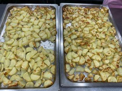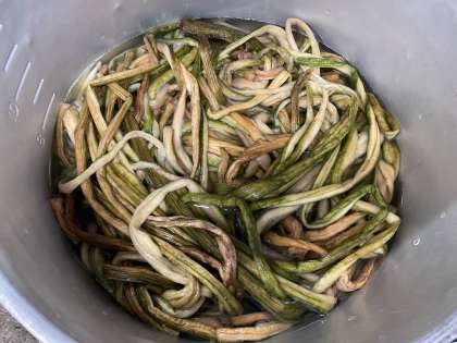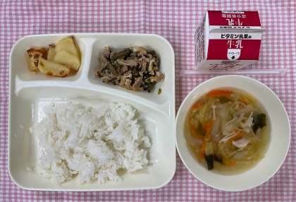 今日の給食は「ごはん、豚肉と干しずいきのみそ煮、すまし汁、あげ焼きじゃが、牛乳」でした。ずいきは、さといもの葉柄(ようへい)という部分です。今回は乾物なので、まずもみ洗いしてぬるま湯で戻し、ゆでてしっかりアク抜きをしてから使いました。食感は、柔らかいながらもシャキシャキして味もよくしみていました。見た目はあまりきれいな色ではないのですが、食べるとおいしさがわかります。最近は食べることが少なくなってきた食材かと思うので、今回はよい機会になったかと思います。