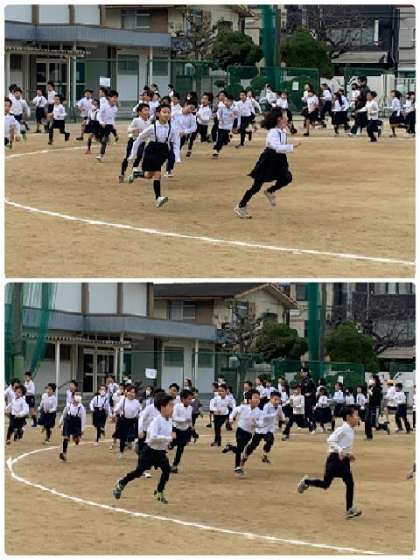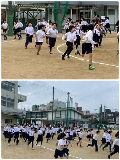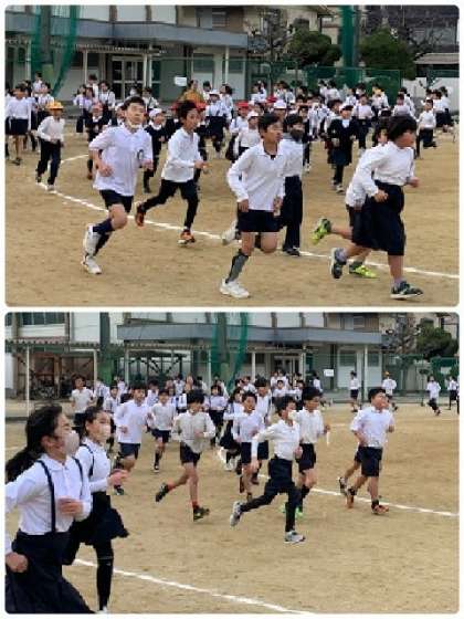1月31日(水)、「かけ足朝会」のため全校児童が運動場に集合しました。軽快な足運びで、運動場を走っています!!