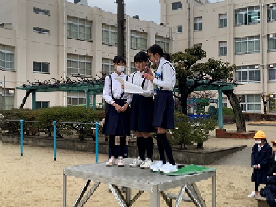 かけ足朝会の後、代表委員会の児童より、来週の「あいさつ週間」について話がありました。代表委員による「あいさつ活動」を実施すること、「元気で気持ちの良いあいさつをしましょう」と呼びかけてくれました。また、代表委員会作成のクイズが用意されているようです。みんな、楽しみに登校しましょう!!