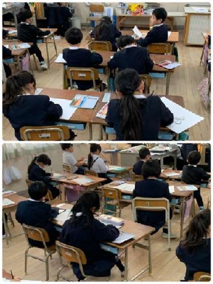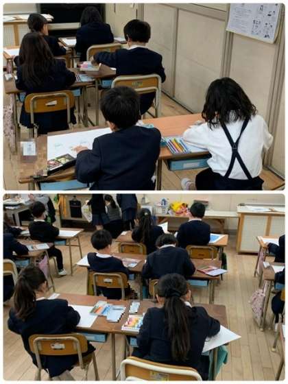1年生の生活の時間です。「2年生になったら、がんばりたいこと」などを絵に描いています。一人ひとり一生懸命考えて、描いています。