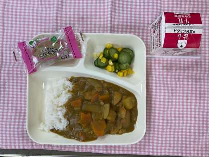 9日の給食は「チキンレバーカレーライス、きゅうりとコーンのサラダ、スイートポテト、牛乳」でした。カレーには、レバーペーストが入っています。味や香りは確かにわかりますが、それほど気になることもなく、おいしく食べることができました。