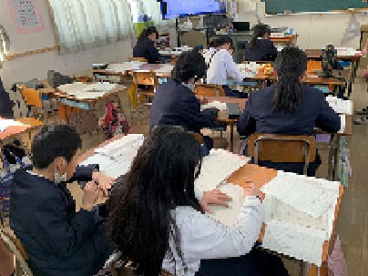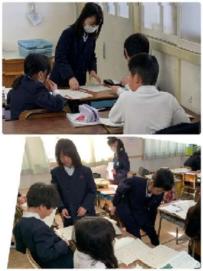 4年生の国語の時間です。単元「調べたことをほうこくしよう」の学習をしています。班でテーマを決めてアンケートをとりました。アンケート結果をもとに、調べたことを発表するための準備をしています。班で意見を出し合いながら、わかりやすく報告するのは・・工夫をしています。