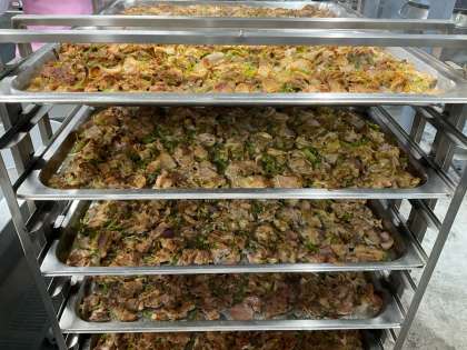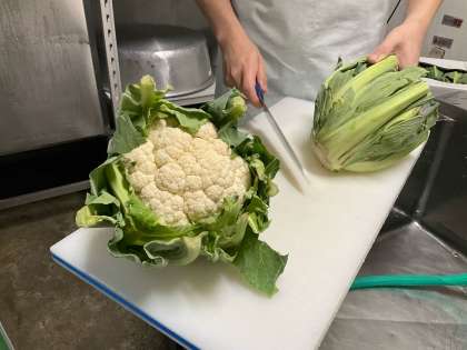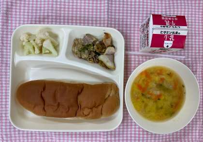 今日の給食は「黒糖パン、豚肉のカレー風味焼き、コーンとはくさいのスープ、カリフラワーのレモンドレッシング、牛乳」でした。豚肉は焼き上がった時にカレーのいい香りが!スープは粒のコーンとコーンクリームが入って、コーンのうま味、甘みを味わうことができました。カリフラワーは、レモンのさわやかな酸味でさっぱりと。今日もおいしくいただきました。