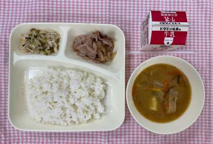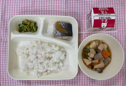 13日の給食は「ごはん、豚肉のしょうが焼き、さつまいものみそ汁、切干しだいこんのゆずの香あえ、牛乳」でした。みそ汁のさつまいもはほっくり甘くて好評。切干しだいこんもさっぱりしておいしかったのか、おかわりに手を挙げてくれる人がたくさんいました。