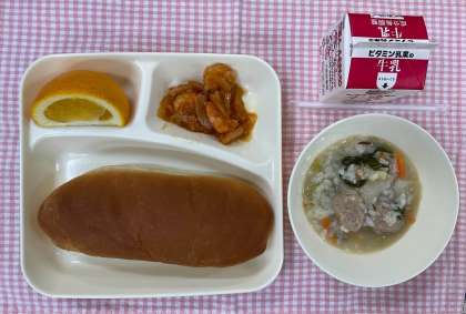 14日は「黒糖パン、えびのチリソースいため、中華がゆ、はっさく、牛乳」でした。中華がゆの肉だんごは、大きくてボリュームがありました。はっさくは、皮の固さと酸味に悪戦苦闘する子もいましたが、「お家にもはっさくあるよ!皮もむける!」と言ってむくのを見せてくれる子もいました。