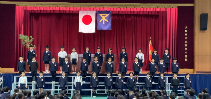 3月19日(火)に実施した児童集会では、1年生が、新しい1年生をお迎えするために練習してきた「おむかえのことば」を、全校児童に見てもらいました。少し緊張しながらも、とてもしっかりと発表していました。