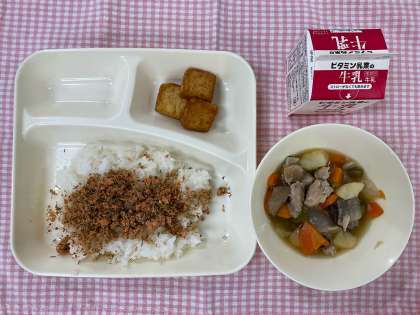 今日の給食は「ごはん、鶏肉とじゃがいもの煮もの、あつあげのしょうゆだれかけ、紅ざけそぼろ、牛乳」でした。1年生は小学校での初めての給食です。3時間目くらいから給食の話、エプロンの着方、たたみ方などを練習しました。今日は6年生が給食の準備、片付けを全てしてくれ、それをしっかりと見ていました。