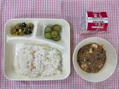 今日の給食は「ごはん、マーボーどうふ、きゅうりの中華あえ、ツナとチンゲンサイのいためもの、牛乳」でした。マーボーどうふは人気メニューです。そのほかのおかずは、きゅうりやチンゲンサイといった野菜をたくさん使っています。もしかしたら苦手な子が多いかもしれないと思いましたが、「きゅうり、ぱりぱりでおいしいよ!」「コーンのおかず味おいしい!」など、しっかり食べてくれる様子が1年生でも見られました。
