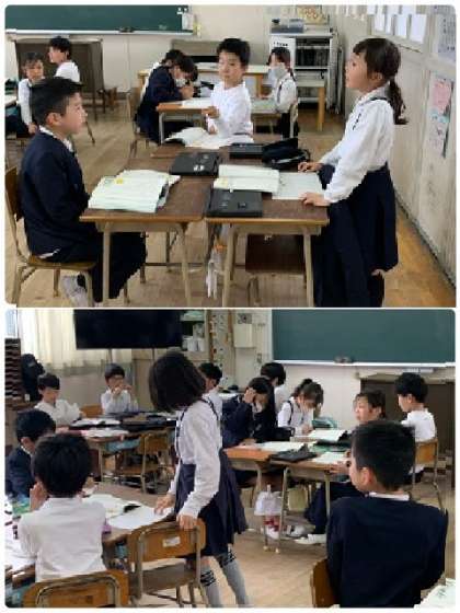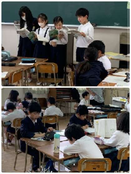 3年2組の国語の時間です。物語「すいせんのラッパ」を学習してきました。学習したことを生かして、班で音読しています。他の班の音読を聞いて、よかったところを発表しています。