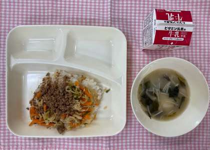 19日は「ビビンバ、トック、牛乳」でした。ご飯にお肉の具と野菜の具をかけて、混ぜて食べるビビンバはボリュームがありました。