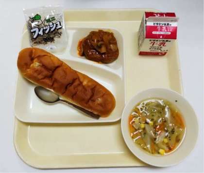 22日の給食は「おさつパン、煮こみハンバーグ、野菜スープ、ミニフィッシュ、牛乳」でした。煮こみハンバーグは柔らかく、ふわっとやさしい味でした。