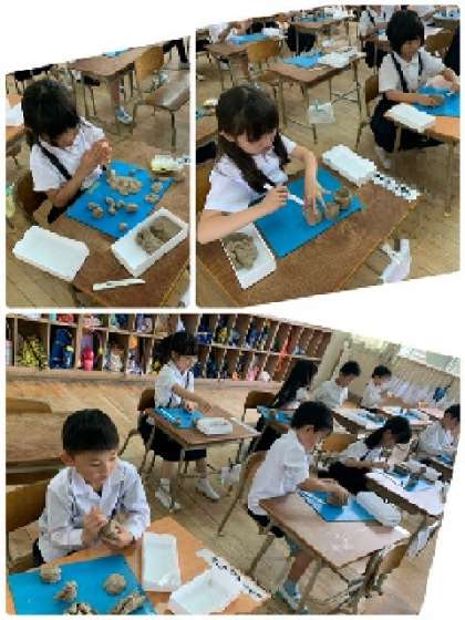 1年1組の図工の時間です。粘土工作に取り組んでいます。先生が写真を見せながら、いくつか作り方を教えてくれました。参考にしながら、それぞれが好きなものを作っています。とってもすばらしい出来上がりで、戻してしまうのが惜しくなるほどです。また次回、いろいろ作りましょう!