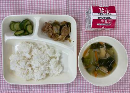 1日の給食は「ごはん、ホイコウロー、中華スープ、きゅうりのピリ辛あえ、牛乳」でした。ホイコウローの豚ばら肉は、先に下ゆでして余分なあぶらを落としてから調理しました。キャベツやピーマンも食べやすく、「この味ならピーマン食べれるよ」という子もたくさんいました。