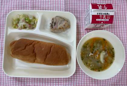 2日は「黒糖パン、かつおのガーリックマリネ焼き、押麦のスープ、キャベツとベーコンのソテー、牛乳」でした。かつおは、ノンエッグドレッシングをからめて焼きているので、パサつきをおさえることができました。スープの押麦のプチプチ食感もよかったです。