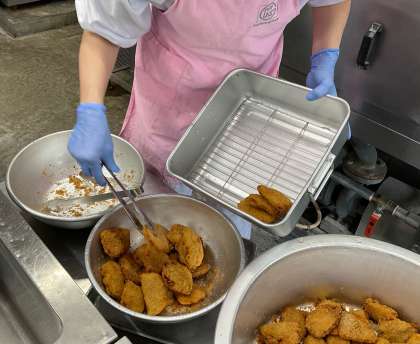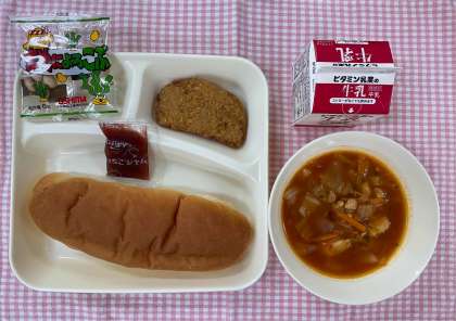 8日の給食は「コッペパン、一口トンカツ、ミネストローネ、豆こんぶ、いちごジャム、牛乳」でした。一口トンカツは、からりと揚がって見た目もおいしそう!子どもたちも大喜びでしたが、食べる時に衣がきれいにはがれてしまうことも。「わぁ!お肉だけになった」「まわりだけになったけど、それもおいしい」などなど。別々になってしまっても大好評には変わりありませんでした。