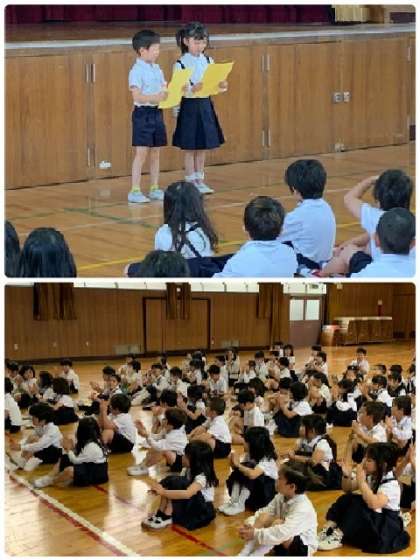 5月15日(水)、2年生が1年生のために「学校たんけん」を企画してくれました。最初に講堂に集まり、2年生の代表児童からのあいさつがありました。その後、グループごとに自己紹介をしてから出発です。