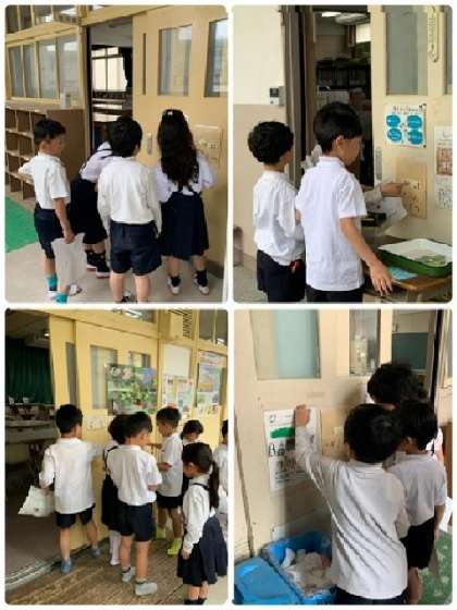 各教室の前には、2年生の手づくり紹介カードが掲示されています。それを見ながら、1年生に、それぞれの教室について説明してくれました。教室の見学が終わったら、シール選んでカードに貼っていきます。たくさんある教室でしが、1年生は少しでも覚えれたかな?!