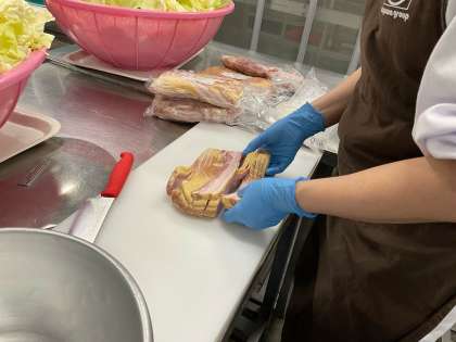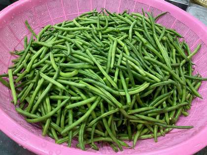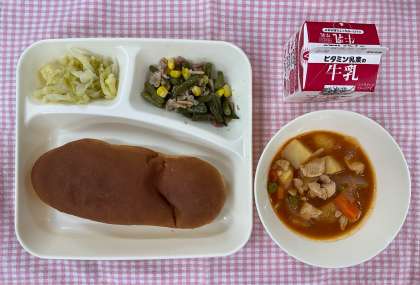 今日の給食は「黒糖パン、ケチャップ煮、ベーコンとさんどまめのソテー、キャベツのバジル風味サラダ、牛乳」でした。普段は冷凍ですが、5月は生のさんどまめが登場します。ベーコンのうま味があったので、食べやすく仕上がりました。