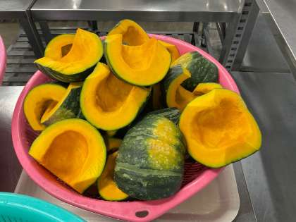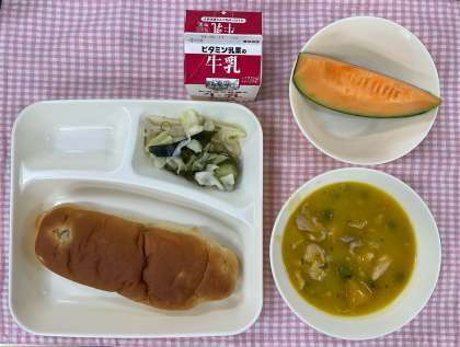 今日の給食は「おさつパン、鶏肉とかぼちゃのシチュー、ミックス海そうのサラダ、クインシーメロン、牛乳」でした。シチューはかぼちゃの甘さがほどよく、やさしい味でした。メロンは少し甘さが控えめのようにも感じましたが、おいしくいただきました。