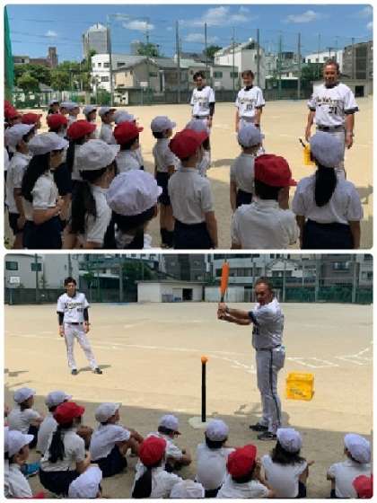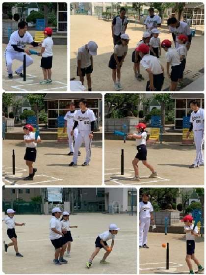 6月7日(金)、「トップアスリート小学校ふれあい事業」で、オリックス・バッファローズのOBコーチに来ていただきました。「トップアスリート小学校ふれあい事業」は、大阪府内の小学校にトップアスリートを派遣し、技術指導や講話等のふれあいを通じて、児童が互いにスポーツの楽しさを共有し、スポーツに親しむ習慣を身につけることを目的とした取り組みです。オリックス・バッファローズのOBコーチ3名の方が、3年生対象に、「ティーボール」の指導をしてくださいました。基本の動きを説明してもらった後、紅白に分かれてゲームをしました。