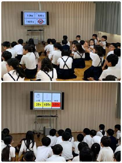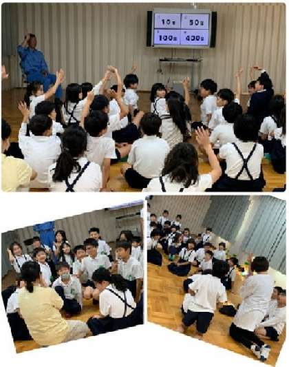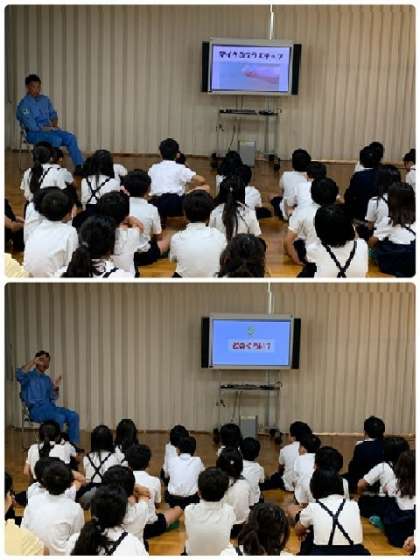 続いて、多目的室に場所を移して・・「地球温暖化」や「海洋ごみ問題」などの話を、クイズ形式で教えてもらいました。進行役の方の巧みな話術に、児童たちも引き込まれて、楽しく学習することができました。5mm以下の小さなプラスティック「マイクロプラスティック」が、海の中で影響を与えなくなるまでに、どのくらいの年数が必要かという質問の際には、その答えに驚いていました。プラスティックの自然に与える影響が大きいことを、改めて学びました。