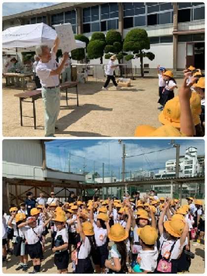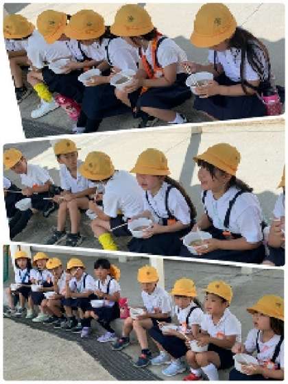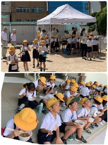 小運動場では、防災リーダーを始めとした地域の皆さんによる「炊き出し訓練」を実施しました。児童たちは、防災リーダーの出題する「防災クイズ」に挑戦しました。その後、「炊き出しの試食」をさせちただきました。低学年の児童の様子です。「おいしい!と、とてもうれしそうです!