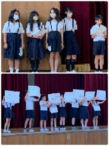 児童集会の最後に、代表委員会より「夏の集い」のスローガンが決定したと発表がありました。