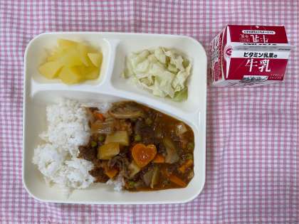 25日の給食〜今日は早いよ〜 公開日 2024/06/25 更新日 2024/06/25 給 食 今日の給食は「ハヤシライス、キャベツのゆずドレッシング、りんご(カット缶)、牛乳」でした。ハヤシライスは上新粉を使ってとろみをつけています。ラッキーにんじんも入っていて大好評!今日はどれも食べやすかったようで、1年生のところでも「私、今日は早いよ。もう全部食べた!」「もう食べ終わるよ!」など、いつもより早く食べ終わった子がたくさんいました。 いいね(0)