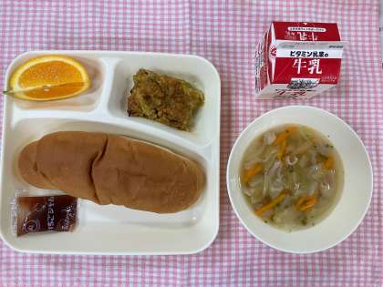 6月27日の給食は「コッペパン、カレードリア、豚肉とキャベツのスープ、オレンジ、いちごジャム、牛乳」でした。カレードリアは子どもたちに大好評。暑い時にカレー味は、食べやすかったです。