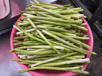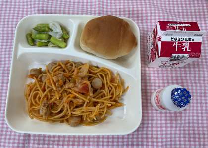今日の給食は「ミニコッペパン、チキントマトスパゲッティ、グリーンアスパラガスとキャベツのサラダ、発酵乳、牛乳」でした。今日は生のグリーンアスパラガスでした。根元のかたそうなところは、ピーラーでけずってくれたので、ずいぶん食べやすくなりました。そして今日は久しぶりの発酵乳の登場です。今日もかなり暑かったので、デザートにさわやかな飲み物はみんなに大好評でした。