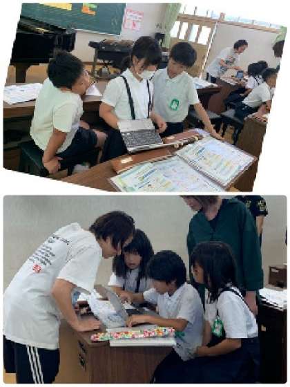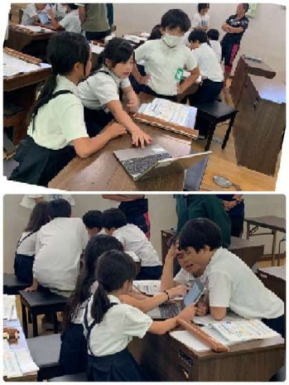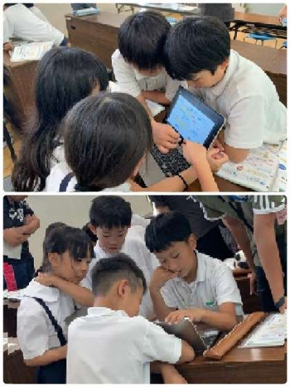 4年生 音楽〜「おまつりリズムバトル」をしよう! 公開日 2024/07/12 更新日 2024/07/12 お知らせ グループで「おまつり」の4文字を使ってアンサンブルを創っています。反復や呼びかけとこたえ、変化を意識してリズムアンサンブルを創っています。タブレットで、自分たちが創ったリズムアンサンブルの構成や音を確認しながら、みんなで協力して考えています。完成した班は、発表の時に担当する部分を決めて練習をしました。 いいね(0)