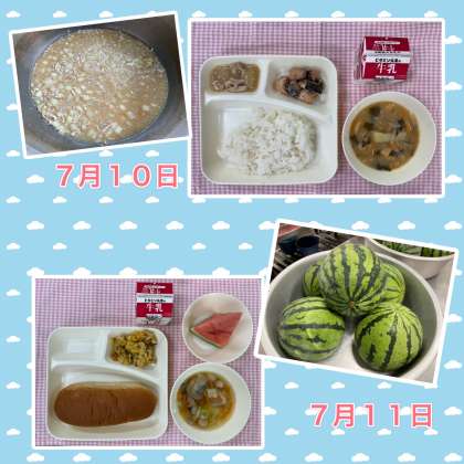 11日は「黒糖パン、チキンパエリア、ウインナーとキャベツのスープ、すいか、牛乳」でした。1年に1回のすいかは、1玉を64等分しています。その話をすると、子どもたちから「すごいなぁ」という声がたくさん!甘くておいしいすいかでした。