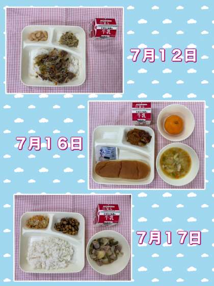 16日は「コッペパン、かぼちゃのミートグラタン、鶏肉と野菜のスープ、みかん(冷)、ブルーベリージャム、牛乳」でした。冷凍みかんは、食べる時でも表面に薄い氷がついている子もいました。「冷たいー!!」「見て!氷だよ!」「おいしい!」暑い日だったので、みんな大喜びでした。