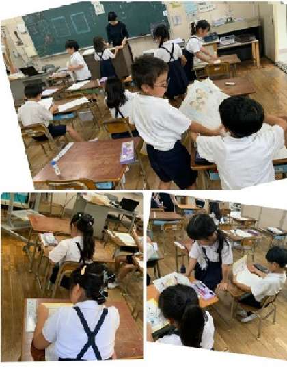 1年2組の様子です。夏休みにおでかけしたり、楽しい時間を過ごしたり・・そんな思い出の一にを絵日記にしました。できあがった絵日記を見せてくれながら、その日の様子を教えてくれました。その時の表情が、とても笑顔で・・素敵な時間を過ごしたんだなと感じました。早くできた児童は、発表の練習もしていました。