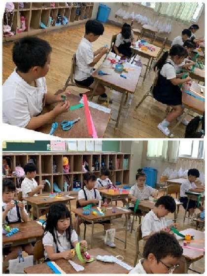 1年2組の図工の時間です。カラフルな色画用紙の帯を使って、飾りをつくりました。切れ目を入れたり、折ったり、丸めたり・・・すると面白い形が出来上がりました!