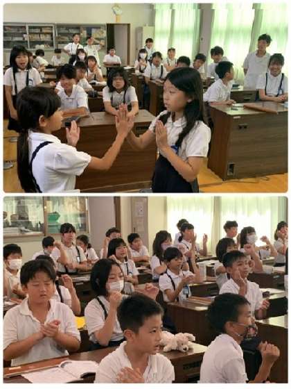 5年生の音楽の時間です。授業の初めに、「アルプス一万尺」の手遊びを楽しみました。およそ半数の児童にとっては、初めてのようでした。先生や知っている代表児童が見本を見せてくれました。一緒に覚えて、楽しみました。
