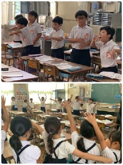 「地球を・・」という一節を聞いて、丸くなろうということで・・教室全体を使いました。文に表現されていることを、動きで楽しんでいます!