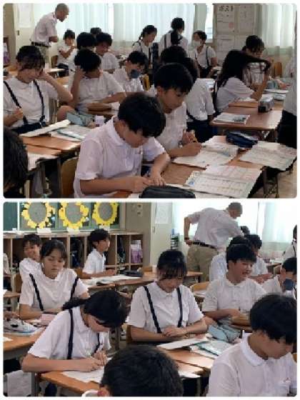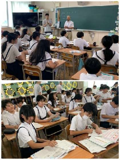 6年生の外国語の時間です。1・2組合同で、C-NETの先生と一緒に学習を進めました。今日は、自分の「一日の生活」を互いに伝え合います。前の時間の続きで、まずは、各自が自分の一日の生活を英語で表しています。できた児童から伝える練習をしています。