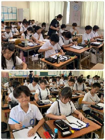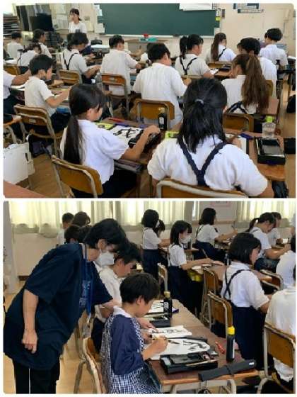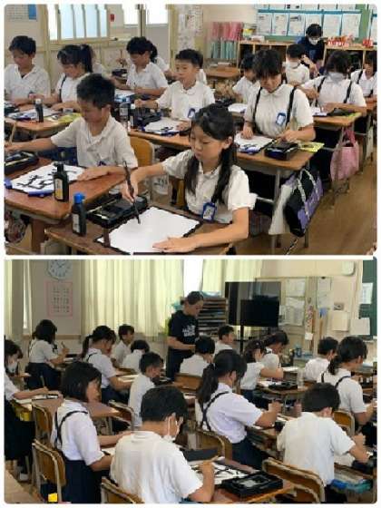 5年生の書写の時間です。今日、取り組んでいる課題は、「成長」です。正しい姿勢で、ていねいに書いています。出来上がった作品は、1F廊下の掲示板と教室に掲示しています。