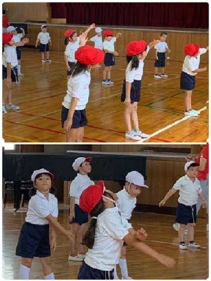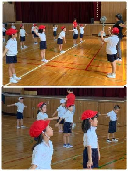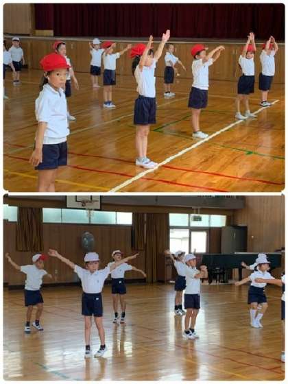 1年1組の体育の時間です。ラジオ体操をしました。すでに知っているという児童と、あまりやったことがないという児童といるようです。これから練習して、覚えていきます!