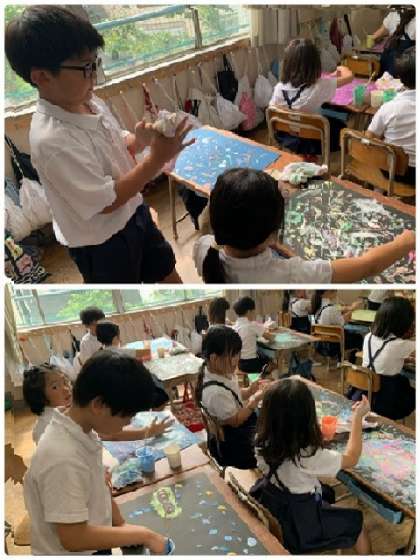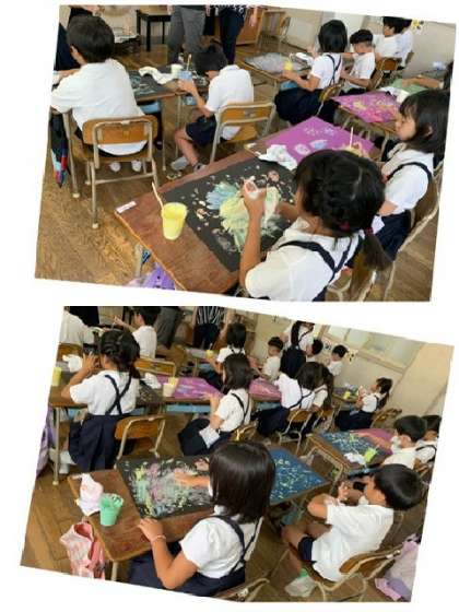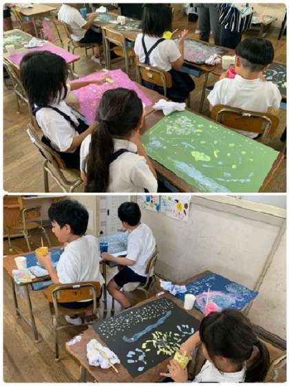 2年生の図工の時間です。今日のめあては、「ゆびや手をつかって、とろとろえのぐであそぼう」です。画用紙の色も自分で選択して、自由な発想で取り組んでいます。