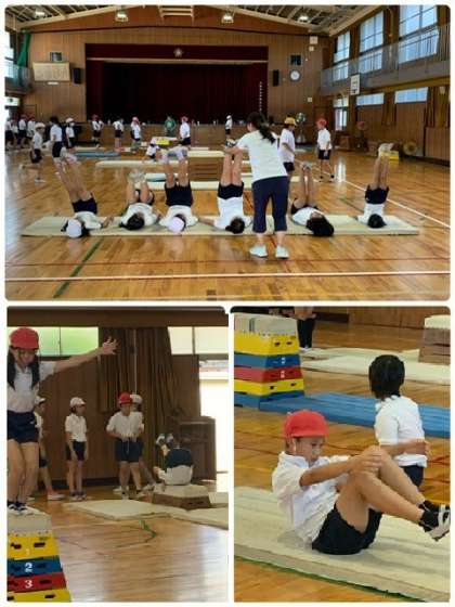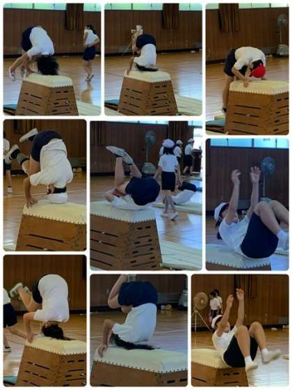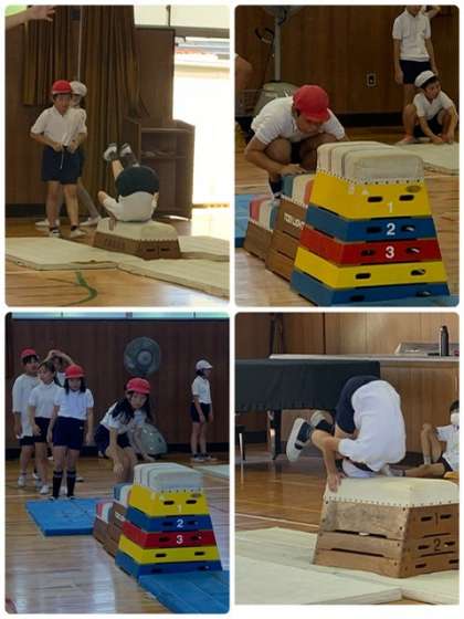 5年生 体育〜台上前転の練習をしました! 公開日 2024/09/05 更新日 2024/09/05 お知らせ 5年生は、体育の授業で「跳び箱運動」をしています。今日は、跳び箱の上で前転をする「台上前転」の練習をしました。最初から跳び箱の上では難しいので、段階を経て練習しています。まずは、マットの上で体の動きを練習。次は、マットの上で前転。跳び箱の上で、高さにも慣れて・・・。低い跳び箱から挑戦しました。できた児童から、少し高くした跳び箱で取り組んでいます。 いいね(0)