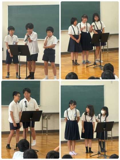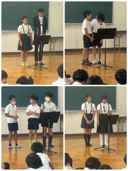 5年生〜よしもと放課後クラブによる「漫才ワークショップ」を実施していただきました! 公開日 2024/09/09 更新日 2024/09/09 お知らせ いよいよ5年生の本番が始まりました。最初は、少し緊張気味でしたが、しだいにペースをつかんできたようです。ワークショップ終了後に、よしもと放課後クラブの皆さんから、「とても上手だった!」とほめていただきました。 いいね(0)