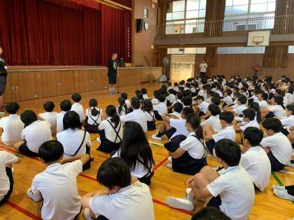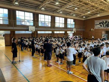 9月9日(月)の児童朝会は、講堂で実施しました。最初に、校長先生からは、「あいさつ週間」について、そして、大阪市の「朝食月間」について話をしてもらいました。(詳しくは、「校長室だより NO24」をご覧ください。)続いて、生活指導担当の先生からは、8・9月の生活目標「黄帽をしっかりかぶって、集団登校しよう」について話がありました。黄帽をかぶるのは、登校時だけでなく、もちろん下校時もかぶりましょうと声かけしてもらっています。9月に入っても、まだまだ気温が高い日が続いています。学校でも、熱中症予防に気をつけて過ごさせていきます。