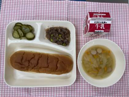 6日の給食は「おさつパン、牛肉のソース煮、スープ、きゅうりのピクルス、牛乳」でした。大人気の献立でしたが、この日はパンが、本当にフワフワ!1年生の教室でも「おさつパン、フワフワ〜」「むっちゃ柔らかい!」「おいもがあまくておいしい!」と大人気でした。