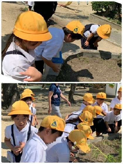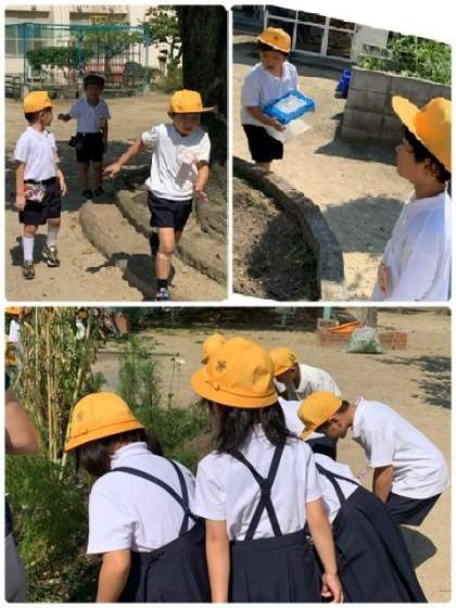 1年生 生活〜いきものと なかよし! 公開日 2024/09/10 更新日 2024/09/10 お知らせ 1年1組の生活の時間です。単元「いきものと なかよし」の学習で、虫探しをしています。どんなところを探したらよいのか、すでに知っているようで、すぐに学習園の土の中から「だんごむし」を見つけていました。見つけた虫たちは、虫かごに入れて観察する予定です。 いいね(0)