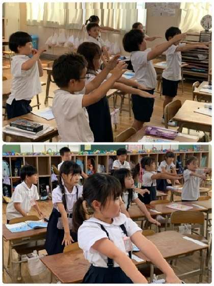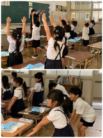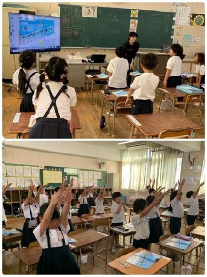 1年2組の音楽の時間です。ド・レ・ミ・ファ・ソ・ラ・シ・ドを、手の高さで表現しました。手の動きをつけながら、「ドレミの歌」を楽しんでいます。