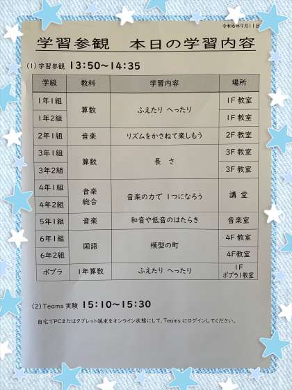 9月11日(水)〜九条北小学校の「学校公開」及び「学習参観」を実施します! 公開日 2024/09/11 更新日 2024/09/11 お知らせ 本日(9月11日)、九条北小学校の「学校公開」及び「学習参観」を実施します。みなさまのお越しをお待ちしています! いいね(0)