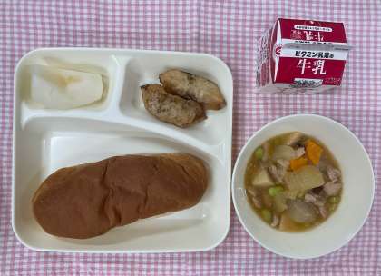 10日の給食は「黒糖パン、あげギョーザ、鶏肉ととうがんの中華煮、なし(豊水)、牛乳」でした。あげギョーザは大好評!カリッと揚がって、ボリュームもありました。季節の果物、なしも登場しました。