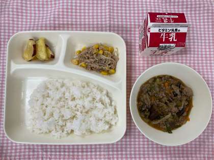 11日は「ごはん、マーボーなす、ツナと野菜のいためもの、焼きさつまいもの甘みつかけ、牛乳」でした。さつまいものは、いもの甘さとみつの甘さで、おいしいデザートに仕上がっていました。